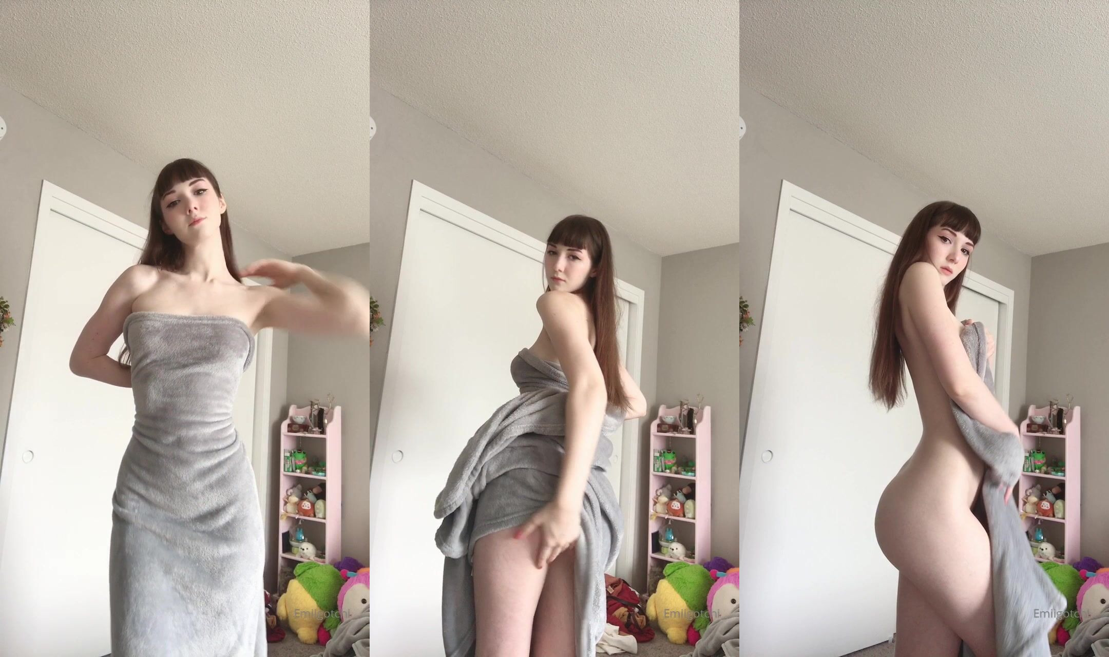 Emi posing naked with grey blanket