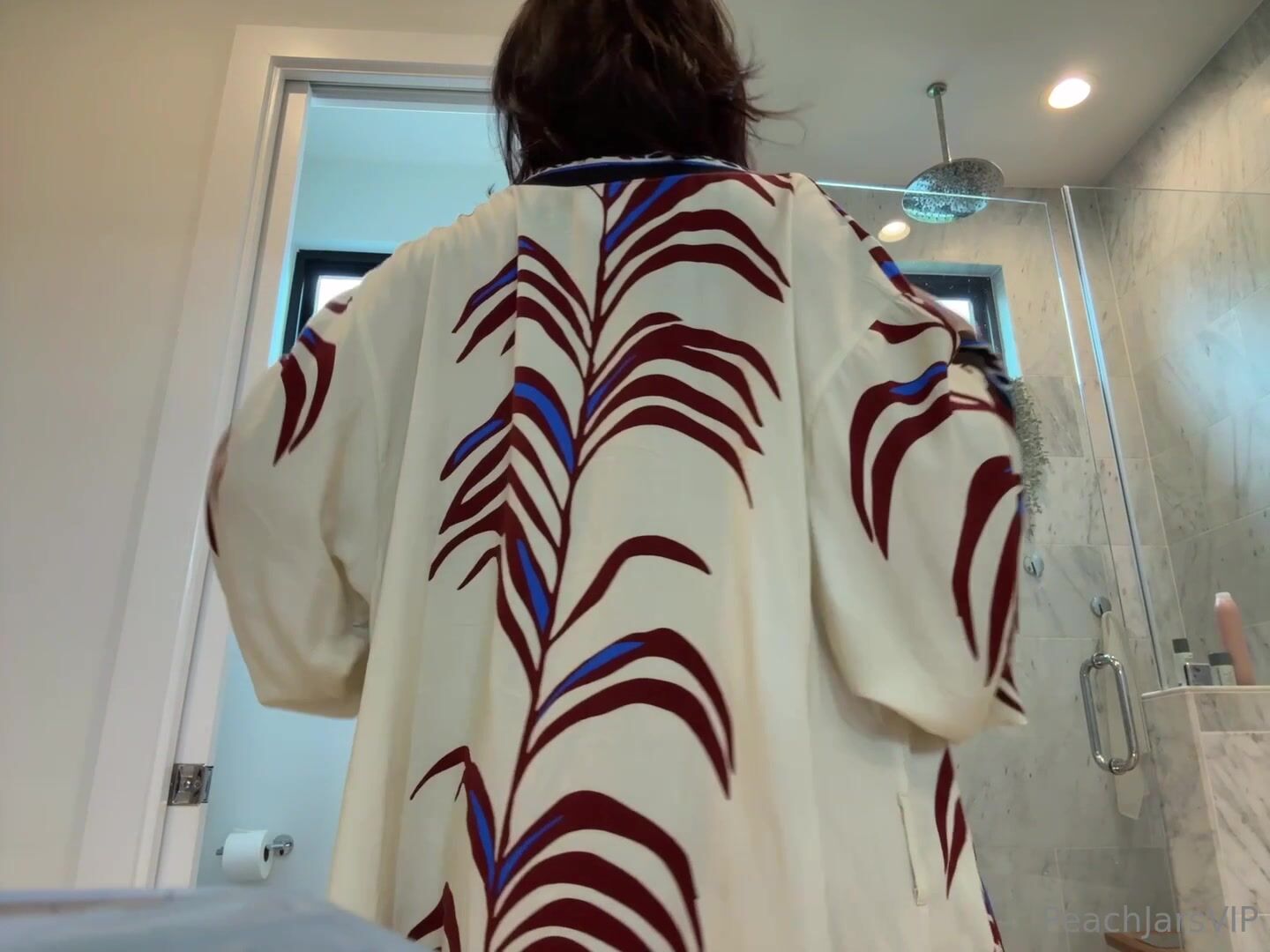 PeachJars takes off her robe in the bathroom