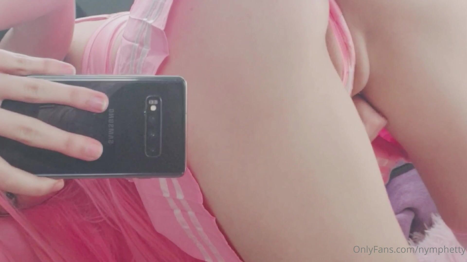 Nymphetty in pink moves her panties to the side